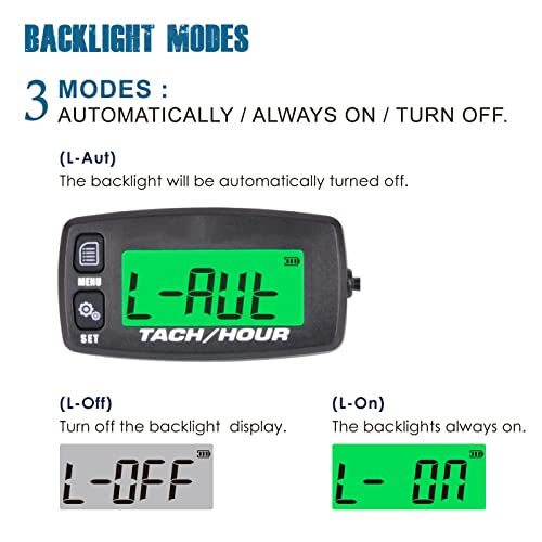 - GREEN & RED BACKLIGHTS DISPLAY ---- Green backligh mode: always-on, OFF and automatical ; Red backlight will display to remind the RPM exceed warning.